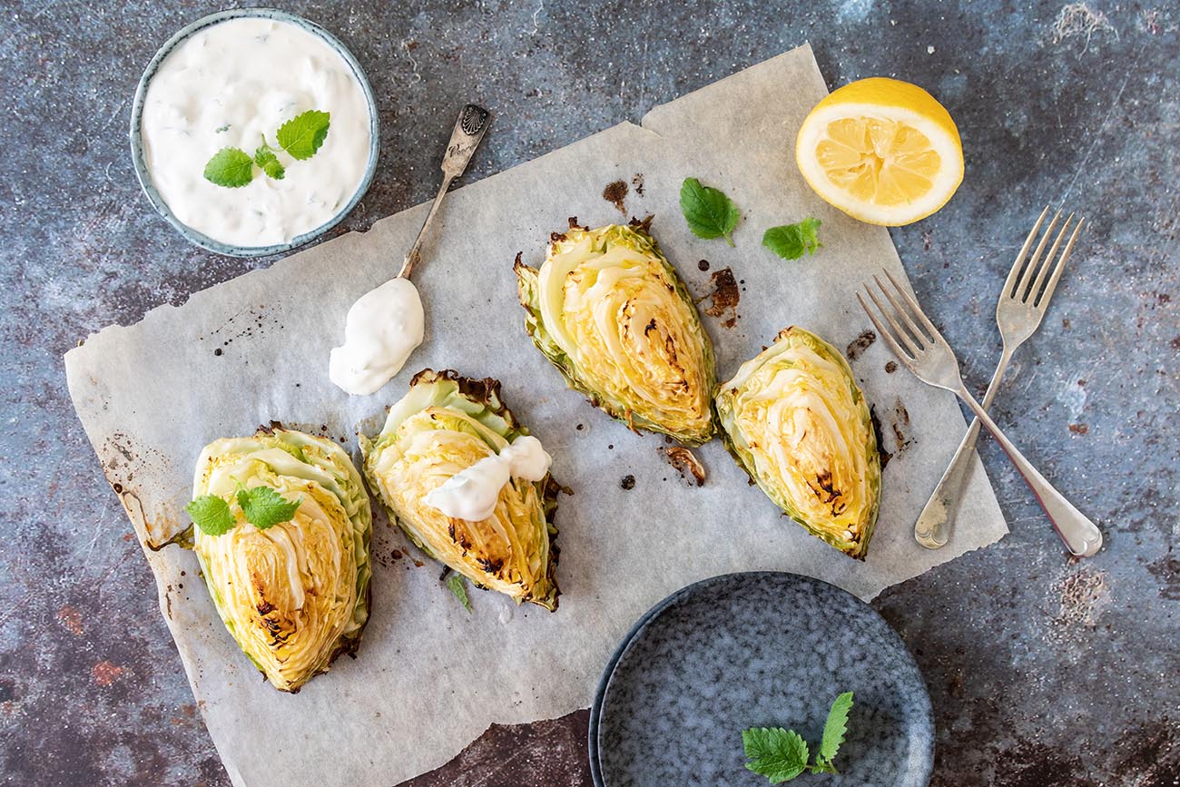 Grillattu varhaiskaali ranskankermakastikkeen kera 1 varhaiskaali Siirappia Voita Suolaa 1/2